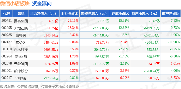 从资金流向上来看,当日微信小店板块主力资金净流入7.0亿元,游资资金净流出4.08亿元,散户资金净流出2.92亿元。微信小店板块个股资金流向见下表: