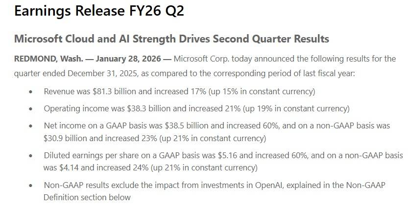 一方面,微软的增长引擎非常稳定。智能云部门营收329亿美元,同比增长29%,生产力与业务流程部门营收341亿美元,同比增长16%,两大板块合计贡献超过670亿美元的收入,继续担当公司的“压舱石”。这一数据也表明,微软的资源配置和战略重心正在进一步向订阅化、云化和企业级场景倾斜。微软云营收达515亿美元、同比增长26%,更是凸显微软向订阅化、云化转型的成效。相较之下,Xbox业务权重持续降低,并且微软的传统基本盘Windows业务也不及预期,OEM及设备行业仅增长1%,Windows本身增长5%,这一表现既反映出PC市场换机周期拉长的现状,也印证了用户需求正趋于理性。