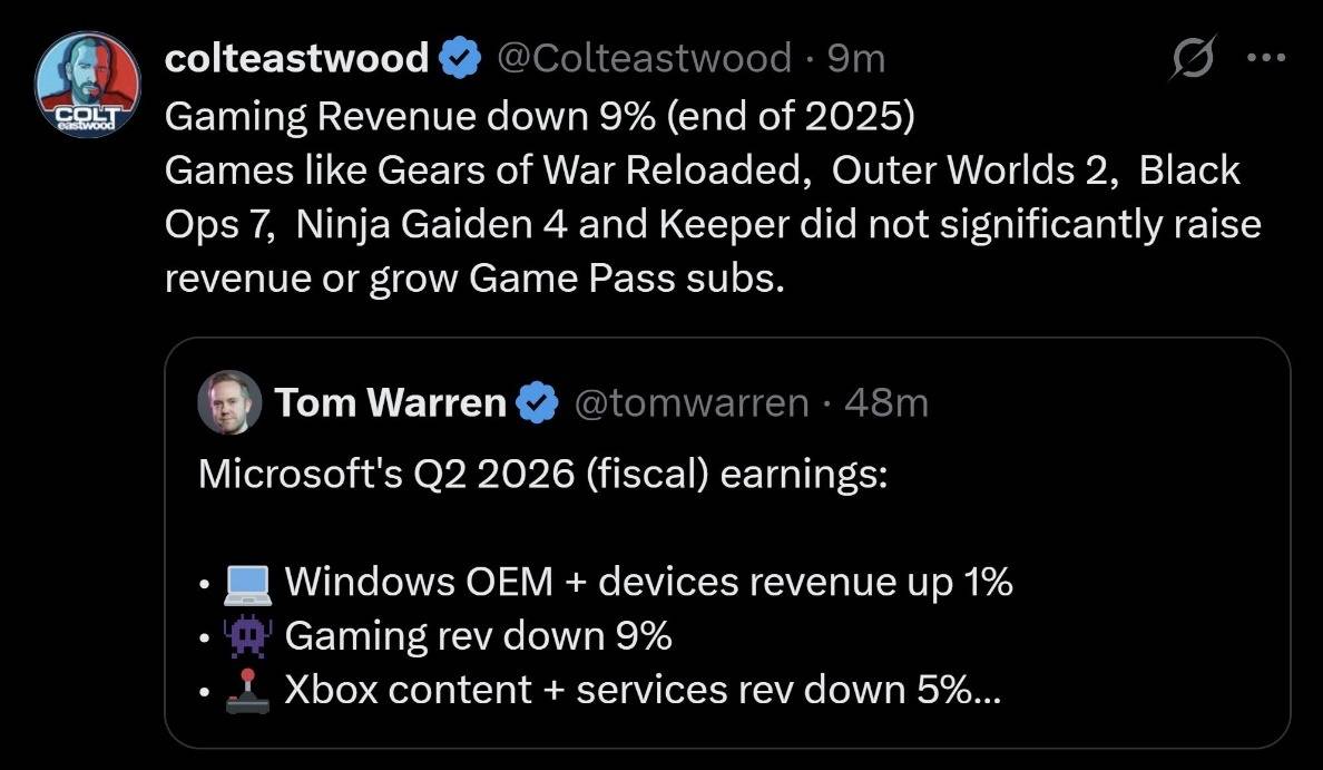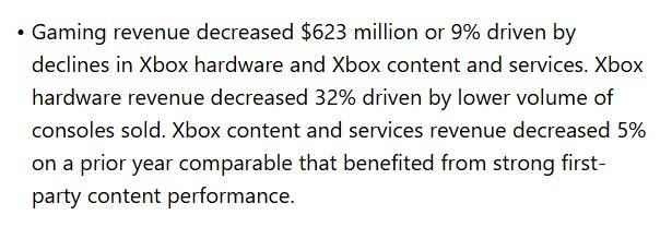 另一方面,游戏业务成为本季度最显眼的短板。微软财报显示,在“更多个人计算”板块中,游戏业务营收同比下降9%。其中Xbox硬件收入同比暴跌32%,成为最直接的拖累项。值得注意的是,内容与服务收入也同比下降5%,意味着压力并不只来自硬件端。对此,微软将服务端走弱归因于对比基数问题,去年同期第一方内容更强,因此今年显得偏弱。这个解释在财务逻辑上成立,同时也把关键矛盾摆上桌面,当游戏部门越来越依赖订阅与服务模式时,第一方内容供给的稳定性,将直接决定用户留存与付费弹性。