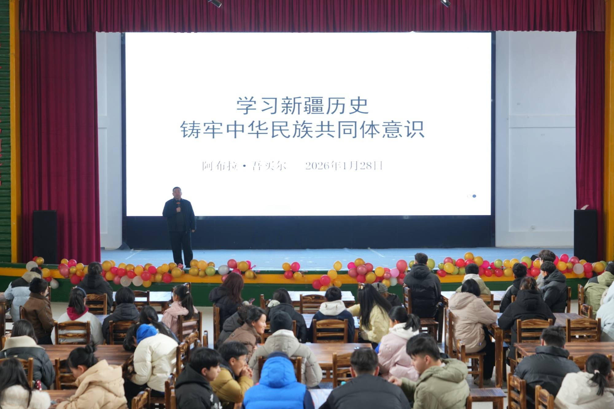 “铸牢中华民族共同体意识”宣讲环节,既有权威解读的深度,更有身边故事的温度。县委宣传部副部长阿布拉·吾买尔以《学习新疆历史,铸牢中华民族共同体意识》为题,串联新疆历史脉络与尉犁发展实际,系统阐释中华民族共同体意识的核心要义与实践价值,让在场大学生深刻领会民族团结的根与魂。