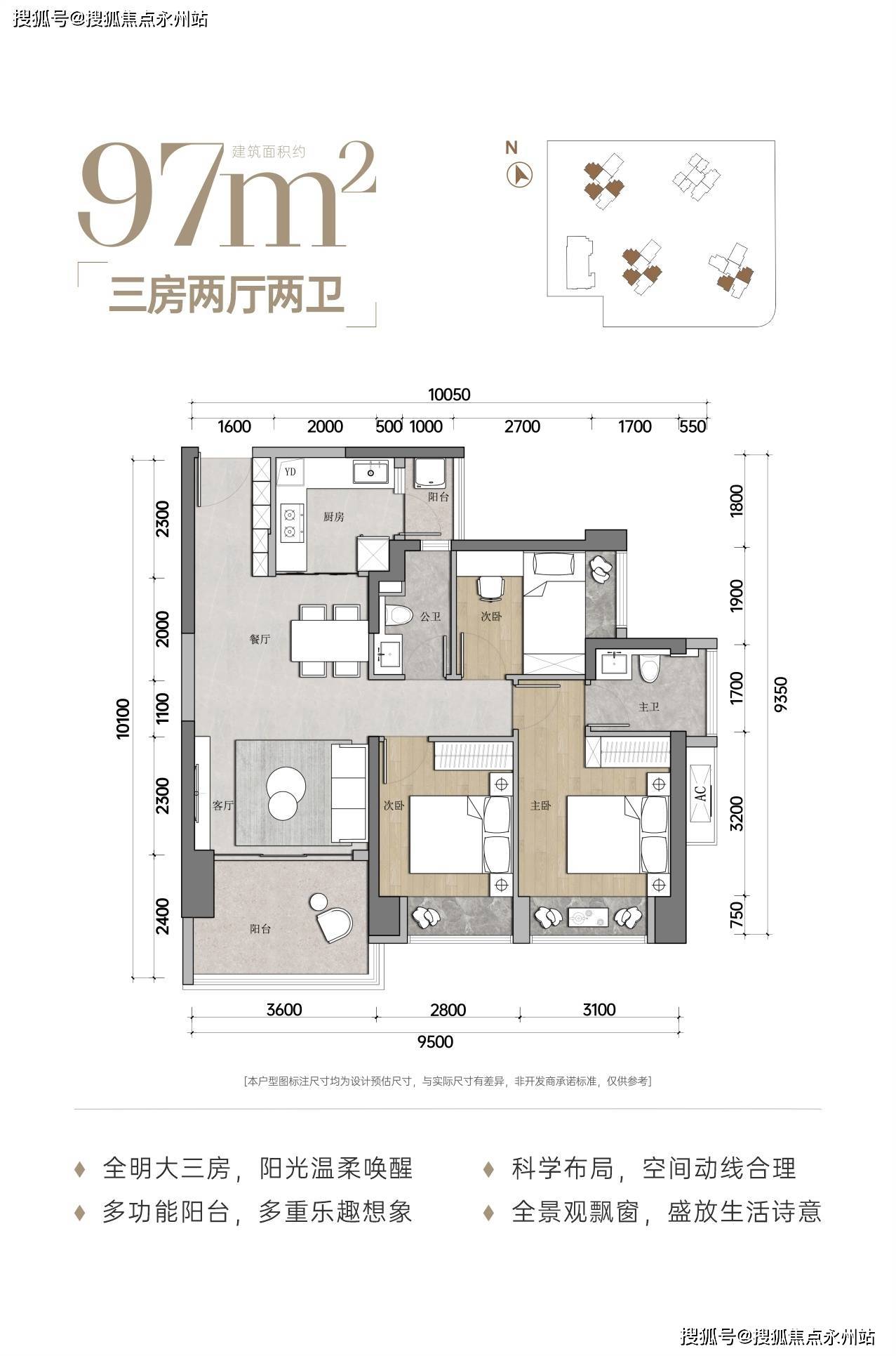 项目主力户型为97平方左右的3房2卫2卫,足有283套,占了一半之多。