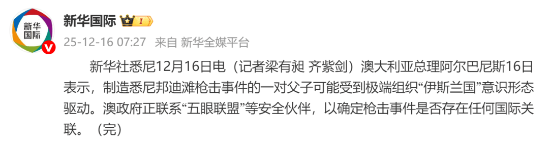 据新华社:澳大利亚总理阿尔巴尼斯16日表示,制造悉尼邦迪滩枪击事件的一对父子可能受到极端组织“伊斯兰国”意识形态驱动。澳政府正联系“五眼联盟”等安全伙伴,以确定枪击事件是否存在任何国际关联。