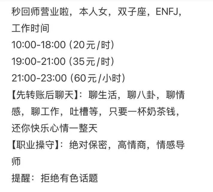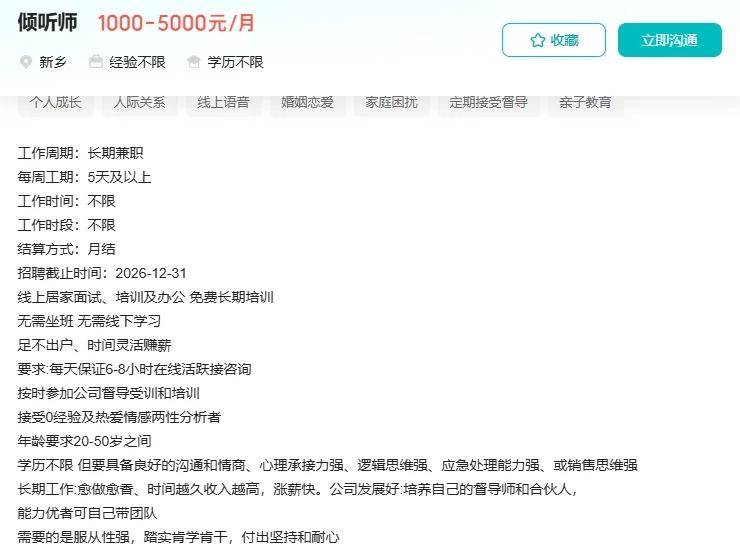 这是最分散、也最有想象力的领域。线上有“秒回师”、“倾听师”。比如一份“倾听师”招聘写的是月薪1000-5000元,要求“每天在线6-8小时接咨询”,处理情绪、恋爱、家庭这些烦恼。它像是一个低门槛、随时能找的“心理按摩”。