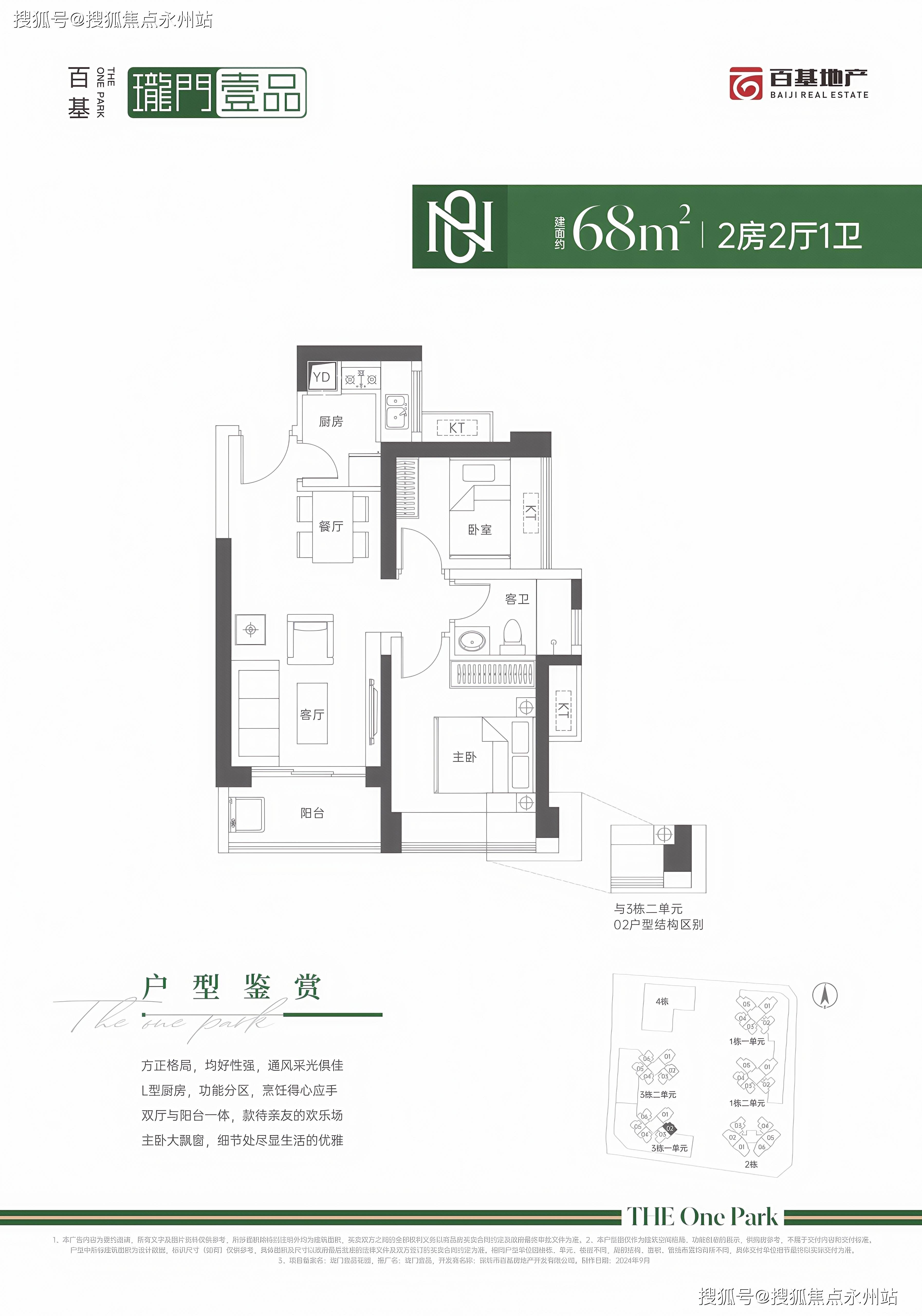 68㎡的2房2厅1卫,仅3栋1单元02户型,设计的是竖厅格局,客厅3.4米开间,LDKB一体化设计,L型厨房,卫生间干湿分离,东南朝向。