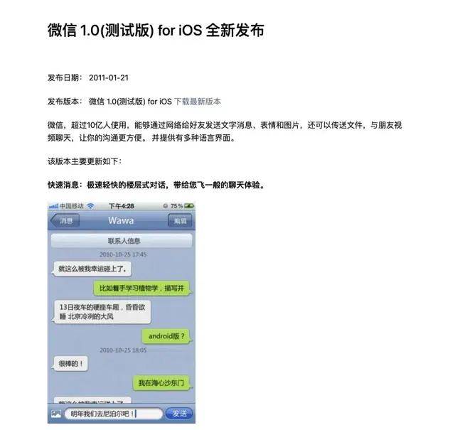 在 2011 年 1 月 21 日,微信 1.0(测试版) for iOS 发布。
