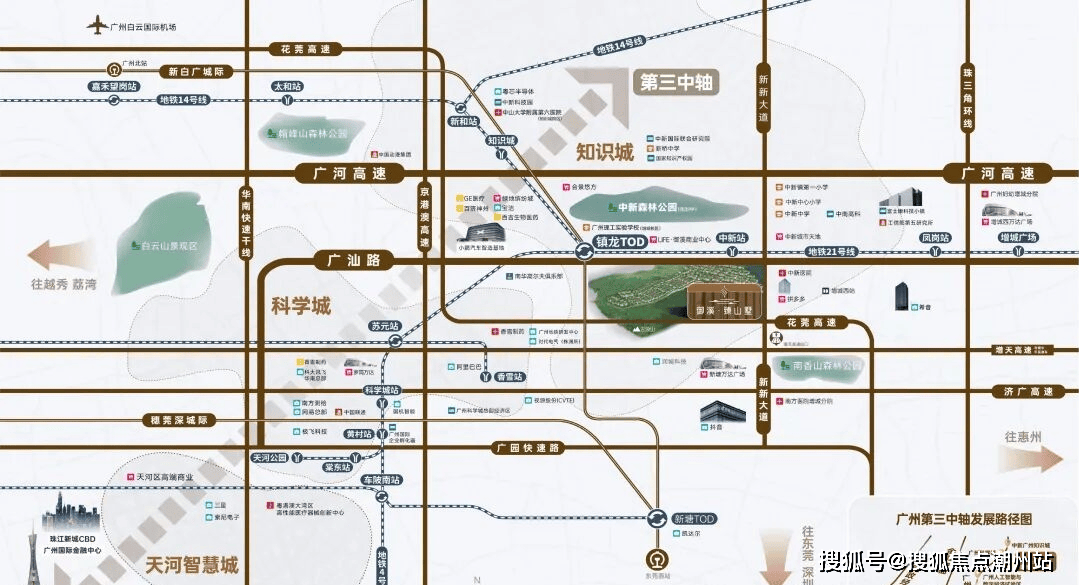 御溪·臻山墅项目距地铁21号线中新站仅约500米,通过家门口的21号线,便可实现1站镇龙TOD、4站天河。而镇龙TOD,又可进一步握手“3地铁+1城轨+5高速”的超级路网,通过14号线可快速畅连黄埔、白云核芯区;搭乘新白广城轨,2站可达新塘,从知识城出发,到达白云机场仅3站,连接穗莞深城际直达深圳机场,快意纵横大湾区。自驾出行同样便捷,华南快速、广河高速、广园快速、增天高速(在建)等4纵6横城市主干道环绕,从家门口驶上干道,便可快速穿越广州主城区。