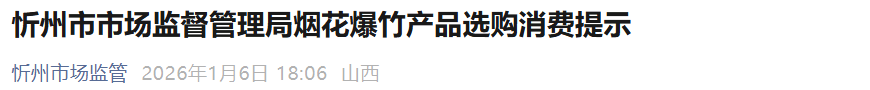 2026年春节将至,为保障烟花爆竹产品质量安全,确保燃放安全,忻州市市场监督管理局提醒广大消费者在选购和燃放烟花爆竹时注意以下事项: