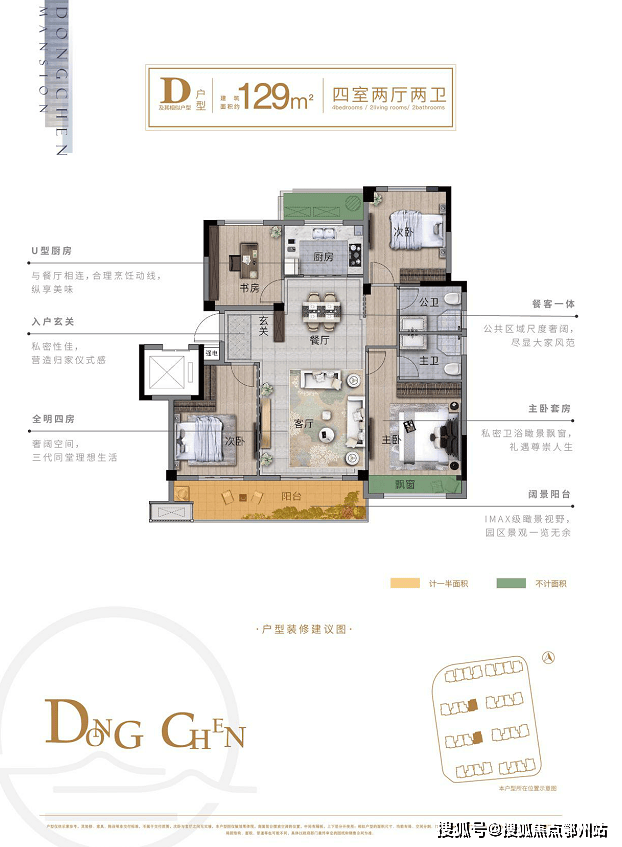 建面约120-129㎡的户型,对于改善家庭而言是不错的置业选择。客餐厅一体并外接双联阳台,可以延伸观景视野。