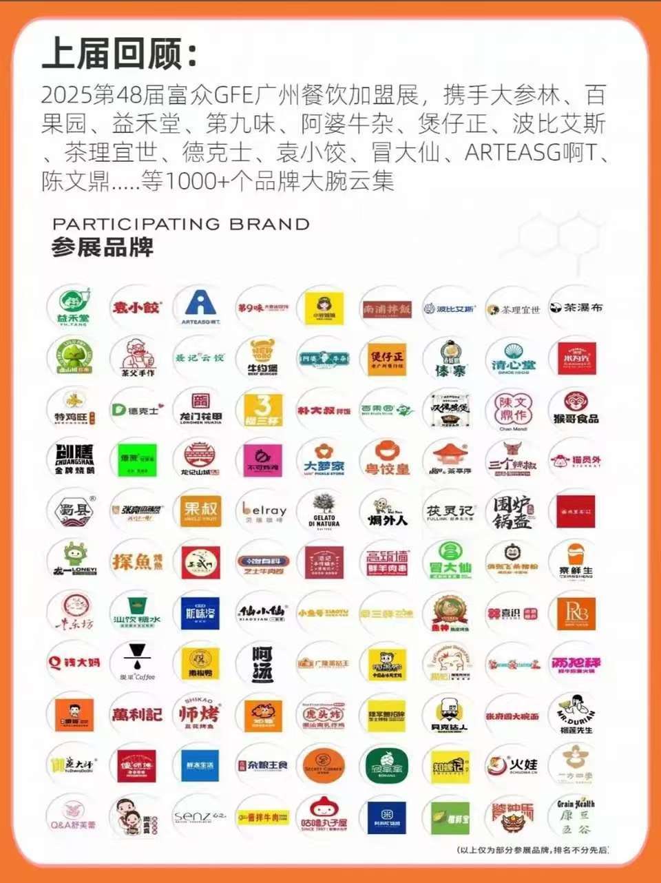 第49届展会吸引1000+优质品牌参展,奠定扎实基础;2026年第50届展会规划展位4300+、品牌2600+、观众35万+,规模逐年扩大,已成为亚洲规模领先、效果突出的餐饮加盟展之一,获“广东会展行业百强企业”(主办方广州富众展览有限公司)认证。