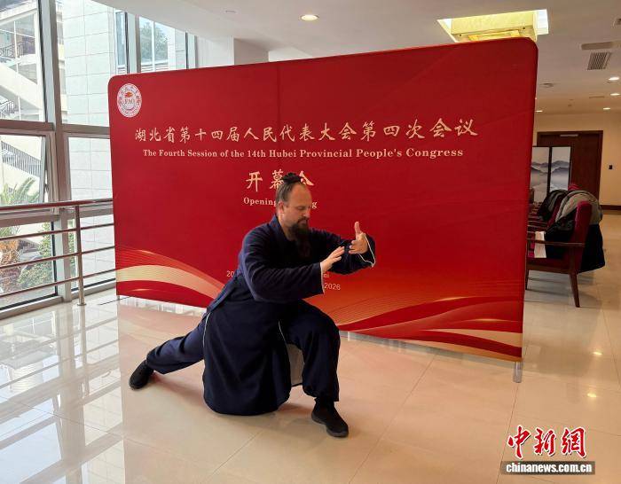 中新网武汉1月30日电 (记者 梁婷)一袭玄色道袍,一招一式尽展风采。武当武术三丰派第十六代传人、美国籍“洋教头”杰克·平尼克,今年旁听湖北两会的间隙,即兴表演起了武当太极拳。