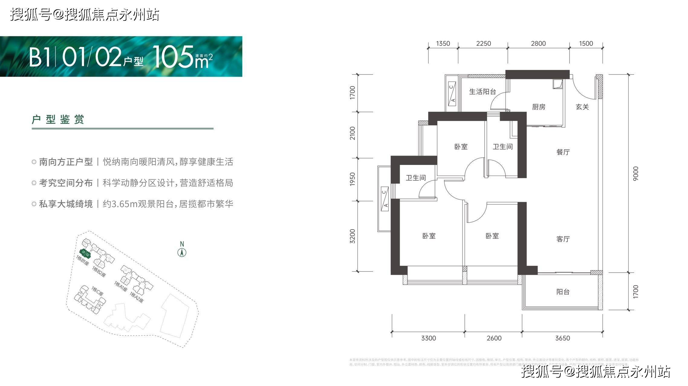 建面约105㎡三房两厅两卫:设计的是竖厅格局,客厅3.65米开间,进门入户玄关,LDKB一体化设计,3个卧室分别做到了3.3米/2.6米/2.5米的宽度,L型厨房还带1个小生活阳台,卫生间干湿分离,得房率:72.01%(不含赠送),阳台朝西南向。