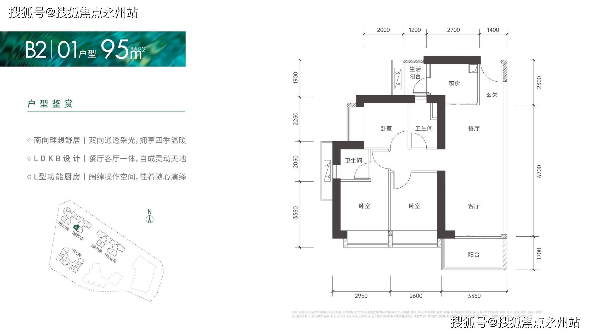 建面约95㎡三房两厅两卫:仅1栋B2座01户型,设计的是竖厅格局,客厅3.35米开间,进门入户玄关,LDKB一体化设计,3个卧室分别做到了2.95米/2.6米/2.25米的宽度,L型厨房还带1个小生活阳台,卫生间干湿分离,得房率:72%(不含赠送),阳台朝西南向。