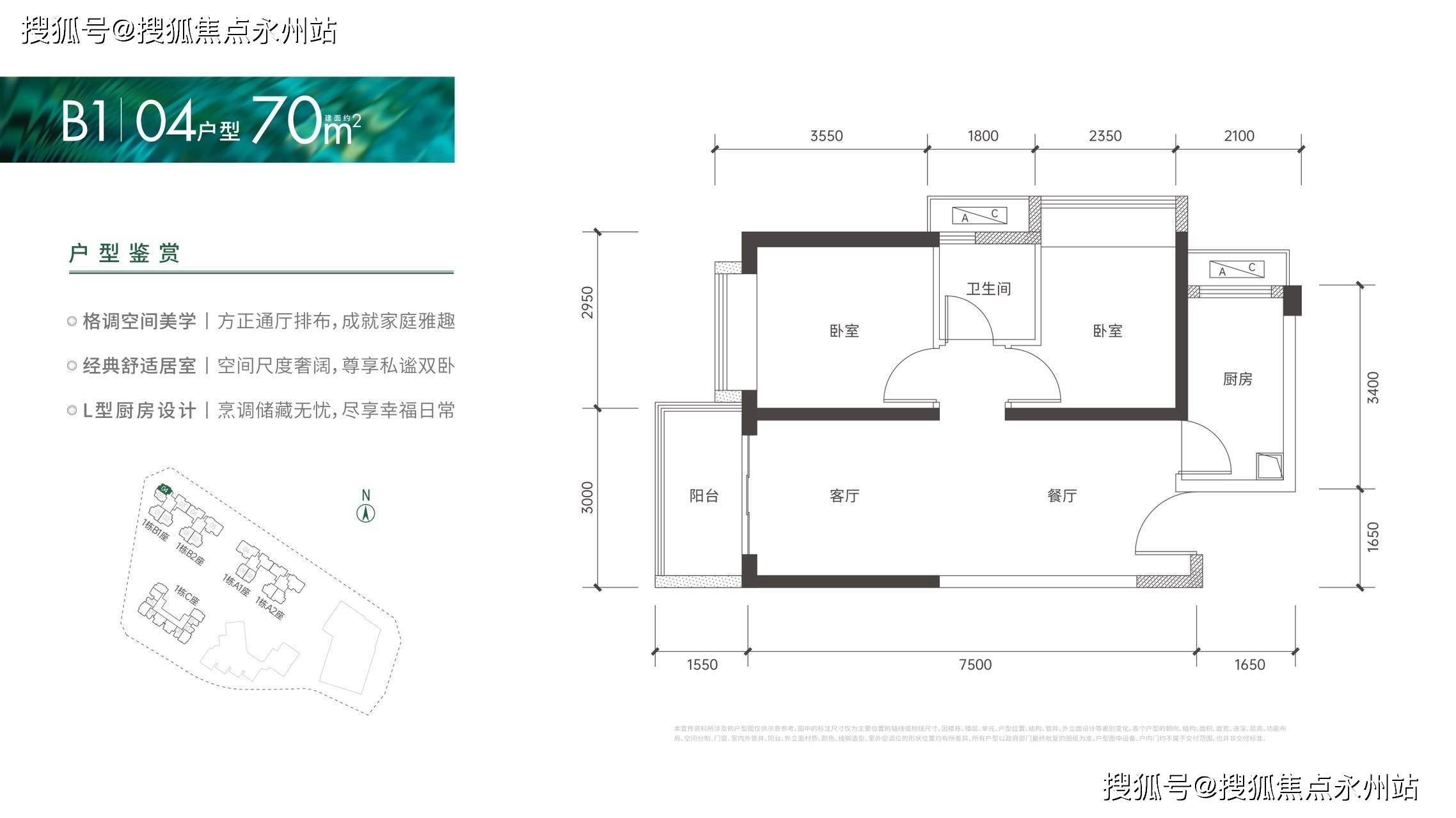 建面约70㎡二房两厅一卫:仅1栋B1座04户型,设计的是竖厅格局,客厅3米开间,餐客厅一体化设计,2个卧室分别做到了2.95米/2.35米的宽度,L型厨房,卫生间干湿分离,得房率:75.66%(不含赠送),阳台朝西北向。