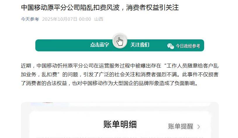 近期,中国移动忻州原平分公司在运营服务过程中被曝出存在“工作人员随意给客户乱加业务,乱扣费”的问题,引发了广泛的社会关注和消费者强烈不满。此事件不仅损害了消费者的合法权益,也对中国移动作为大型国企的品牌形象造成了负面影响。