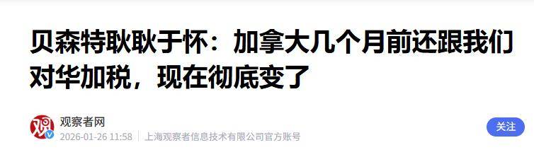 观察者网2026-01-26 贝森特耿耿于怀:加拿大几个月前还跟我们对华加税,现在彻底变了