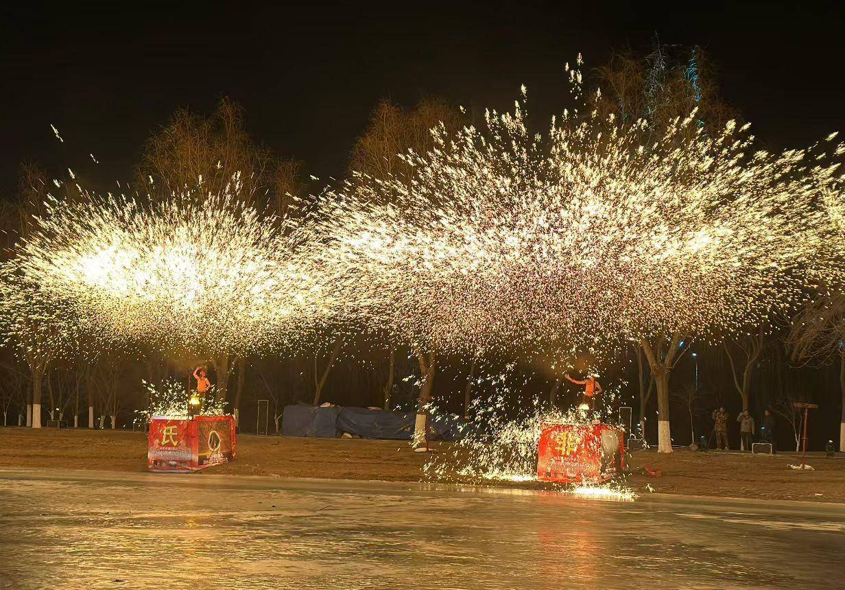 作为本届彩灯大世界的核心亮点,国家级非物质文化遗产“打铁花”表演将震撼回归。每晚18:40与21:00,园区湖面南岸将上演“火树银花不夜天”的壮观景象——非遗传承人手持1500℃高温铁水奋力挥洒,万千金红火花如星河倾泻,与湖面倒影交相辉映,在夜色中绽放出千年技艺的磅礴生命力。相较于去年,今年的打铁花表演规模由2组扩充至4组,让这份独有的“年味”与“烟火气”更加浓烈。