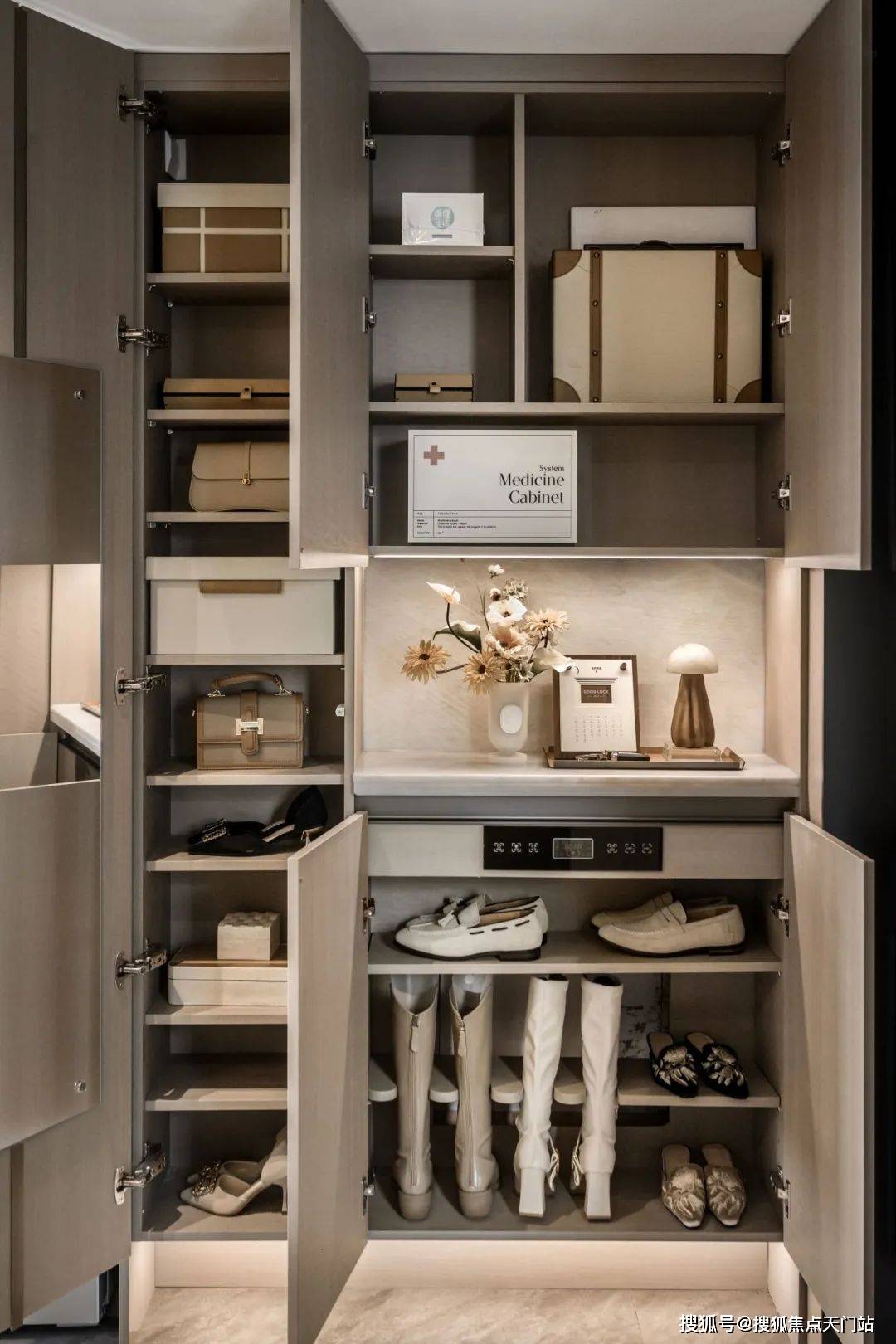 玄关柜设置消毒精灵,在保持健康居家环境的同时,也让生活的情绪感满满。长靴隔板方便长靴的护理与收纳。换季鞋盒收纳区,进一步提升收纳空间。
