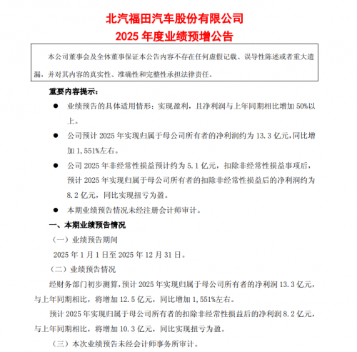 1月29日晚,北汽福田汽车股份有限公司(以下简称“福田汽车”)正式发布2025年度业绩预增公告。公告显示,公司2025年经营业绩实现跨越式增长,预计归属于母公司所有者的净利润约13.3亿元,同比激增1551%;扣除非经常性损益后,归属于母公司所有者的净利润约8.2亿元,交出了一份亮眼的年度答卷。这份业绩的爆发,得益于公司“全面国际化、全面新能源化、全面智能化”三大战略的深度落地,更是全年产品创新、技术突破、市场拓展与降本增效协同发力的必然结果。