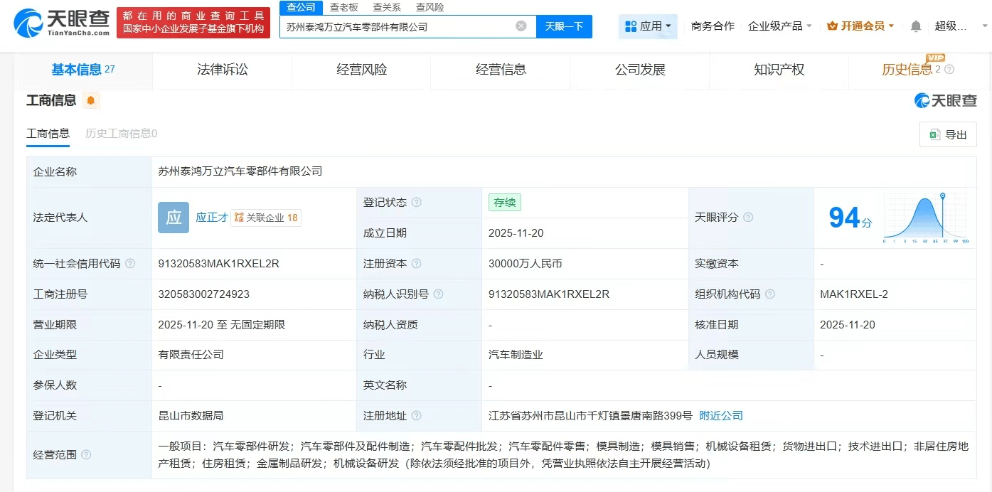 松果财经讯,天眼查App显示,近日,苏州泰鸿万立汽车零部件有限公司成立,法定代表人为应正才,注册资本3亿人民币,经营范围包括汽车零部件研发、汽车零部件及配件制造、汽车零配件批发、模具制造等。股东信息显示,该公司由浙江泰鸿万立科技股份有限公司全资持股。