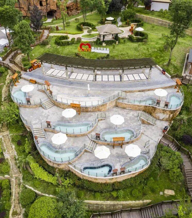走进景区,79个汤池依山而筑,错落隐于绿意之间,空气中弥漫着淡淡的草木清香。