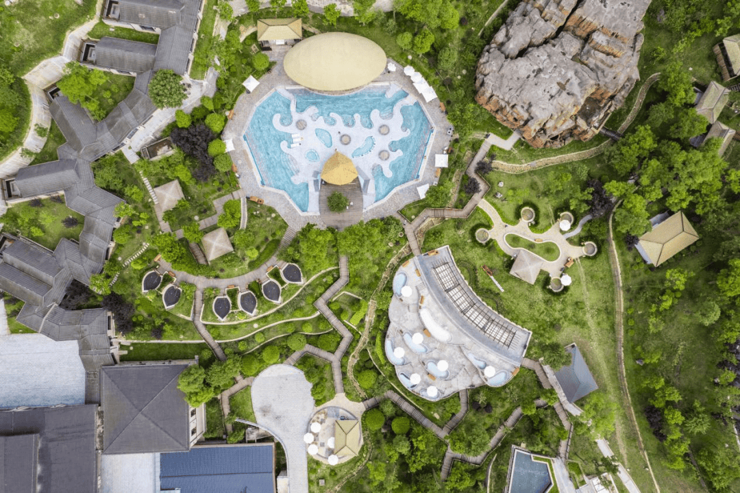 群山环抱,雾气氤氲,一池暖汤静卧其间,悄然洗去都市人的一身倦意。