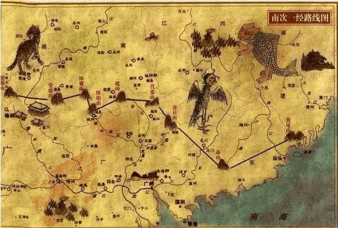 从第一卷《南山经》之首鹊山开始,又东三百里为堂庭山,又东三百八十里为猨翼山……