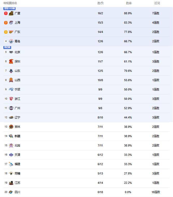 看下CBA积分榜最新排名,浙江广厦、上海久事和广东宏远前3名的球队最稳,排在第4位到8位的球队依次是青岛、北京、深圳、山东和山西。辽宁跌至第12位,新疆第14位。