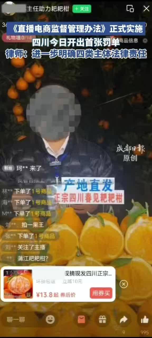 2月1日,记者从成都市市场监管局获悉,近日,成都市蒲江县市场监管局在开展打击电商领域制售假冒伪劣农产品行为专项行动中,依法查处一起主播直播带货虚假宣传、冒充助农推荐官案件,并开出《直播电商监督管理办法》正式实施后的四川首张罚单。