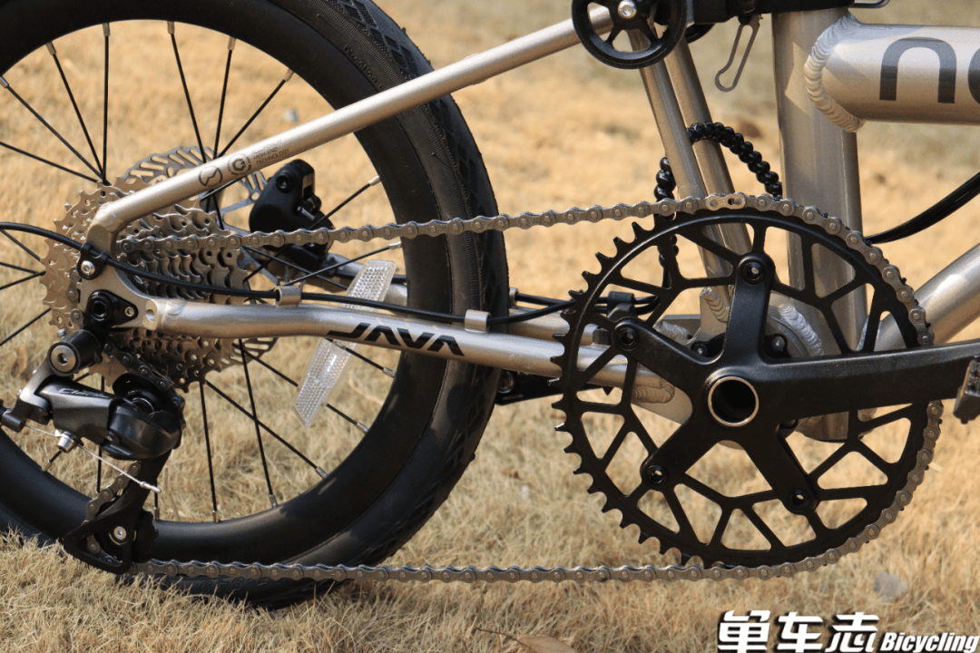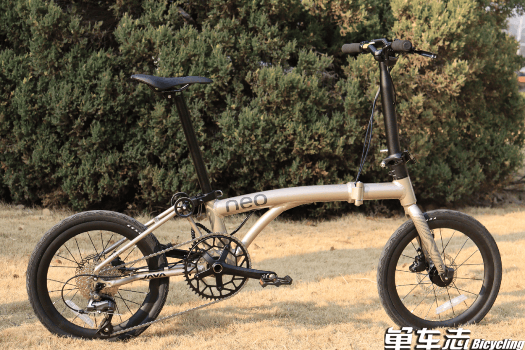 JAVA NEO几乎是全铝上阵,车架是铝合金,前叉铝合金,座管、前后轮也是铝合金。作为长期战斗在公路车市场的JAVA而言,这一出手还保留着其公路车的内卷味。五通位置后移,拥有创新超丝滑五通专利。这一设计让车子在折叠的时候特别顺滑。