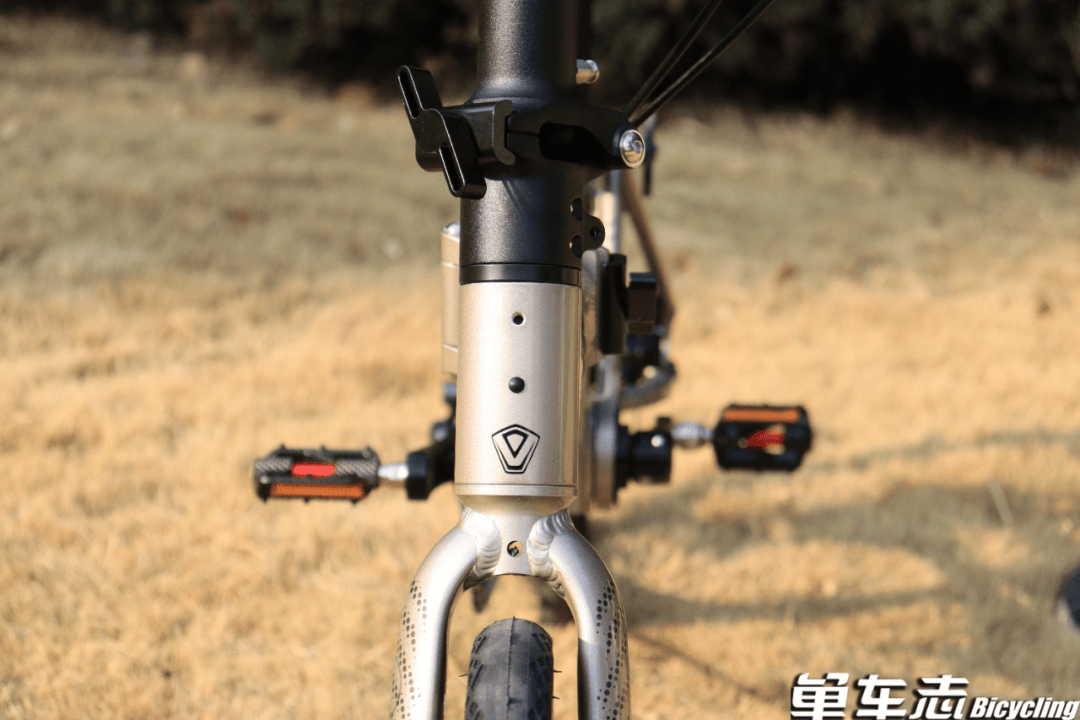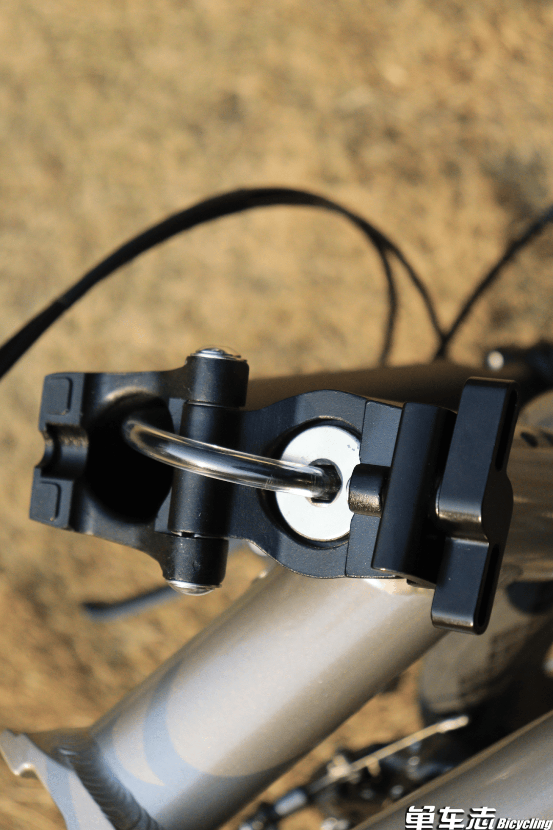 ▲旋开折叠口车把手也折叠下来,按一下就紧挨前叉不晃动了。