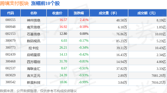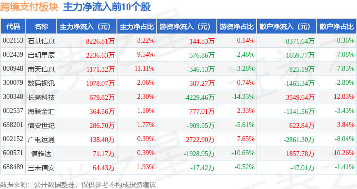 从资金流向上来看,当日跨境支付板块主力资金净流出8.96亿元,游资资金净流入4.05亿元,散户资金净流入4.91亿元。跨境支付板块个股资金流向见下表: