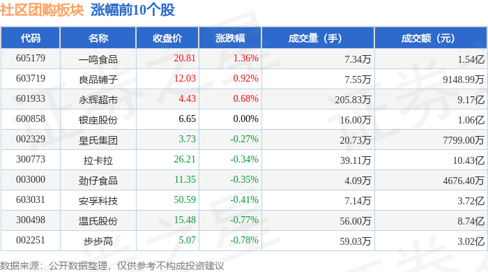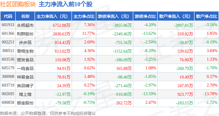 从资金流向上来看,当日社区团购板块主力资金净流出6.85亿元,游资资金净流入1.23亿元,散户资金净流入5.62亿元。社区团购板块个股资金流向见下表: