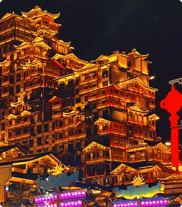 第4天:土司城→芙蓉镇。上午逛土司城,九重天吊脚楼特别壮观,拍照很出片,还看了摆手舞、打溜子非遗表演,小纤给我们讲了土司历史和土家族民俗,收获满满。中午吃完午饭,驱车1个多小时到芙蓉镇,这座“挂在瀑布上的古镇”名不虚传,尝了10元一碗的刘晓庆米豆腐,Q弹爽口。傍晚等古镇亮灯,灯光映着瀑布,古韵和烟火气都有,晚上住古镇周边民宿,推窗就能看到瀑布夜景。