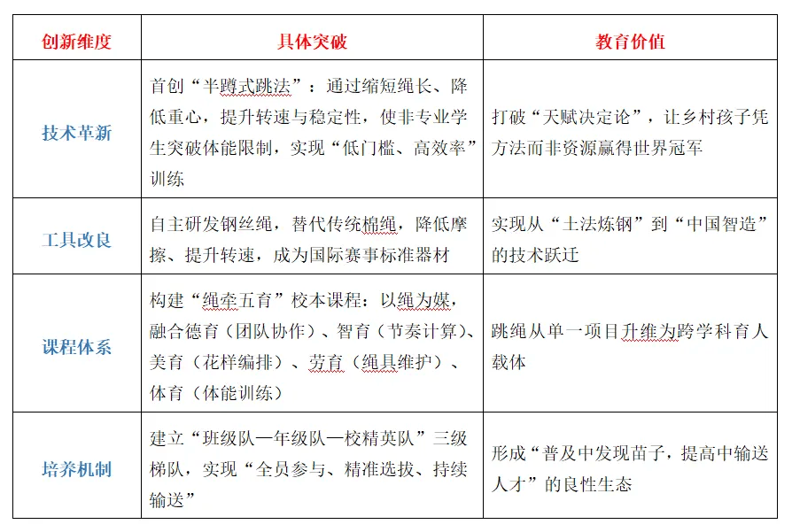 社会辐射:花东镇举办千人跳绳村超赛,50个村居全员参与,形成“跳绳小镇”品牌;故事被改编为电影《点点星光》,荣获第33届金鸡奖最佳儿童片,成为国家级教育宣传片;开发90节公益线上课程,惠及全国超百万师生,实现“一根绳子,连接城乡”;