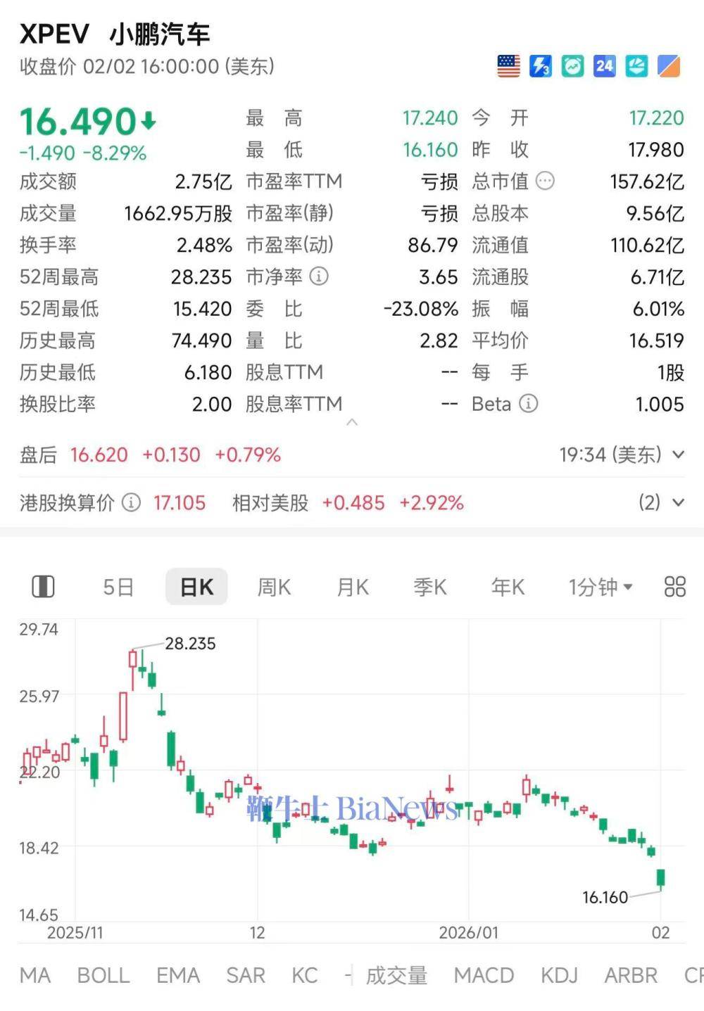 2月3日消息,小鹏汽车美股大跌8%,报每股16.490美元,总市值157.62 亿美元。