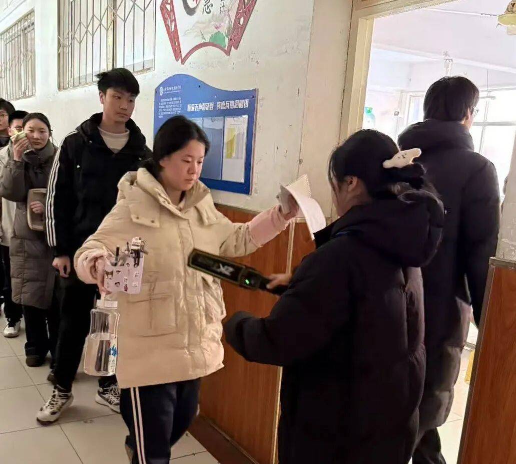 监考教师们提前到达考务办公室,领取试卷、核对信息、接受最后指示。他们佩戴统一监考证,神情庄重而温和。开考前15分钟,学生们有序入场,监考教师手持金属探测器,逐一检查。