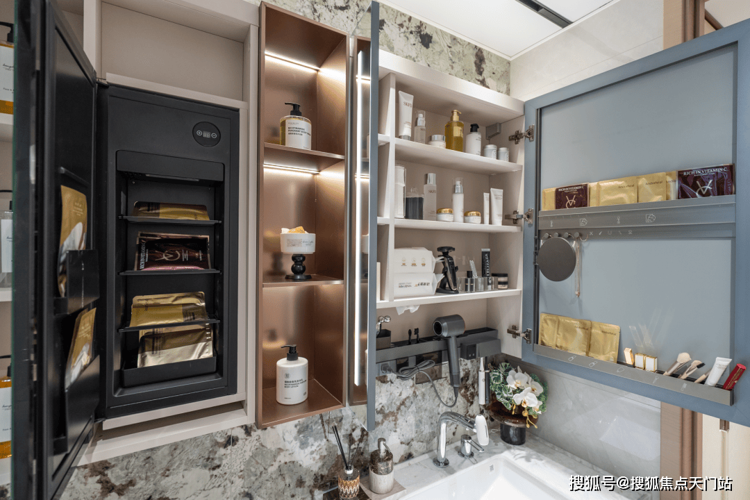 卫浴:镜柜内置分区、卫浴柜斜翻抽等设计,为女主人量身定制。美妆灯与抽拉龙头的 “感官SPA” 系统,将洗漱升级为一场全方位的护理体验。