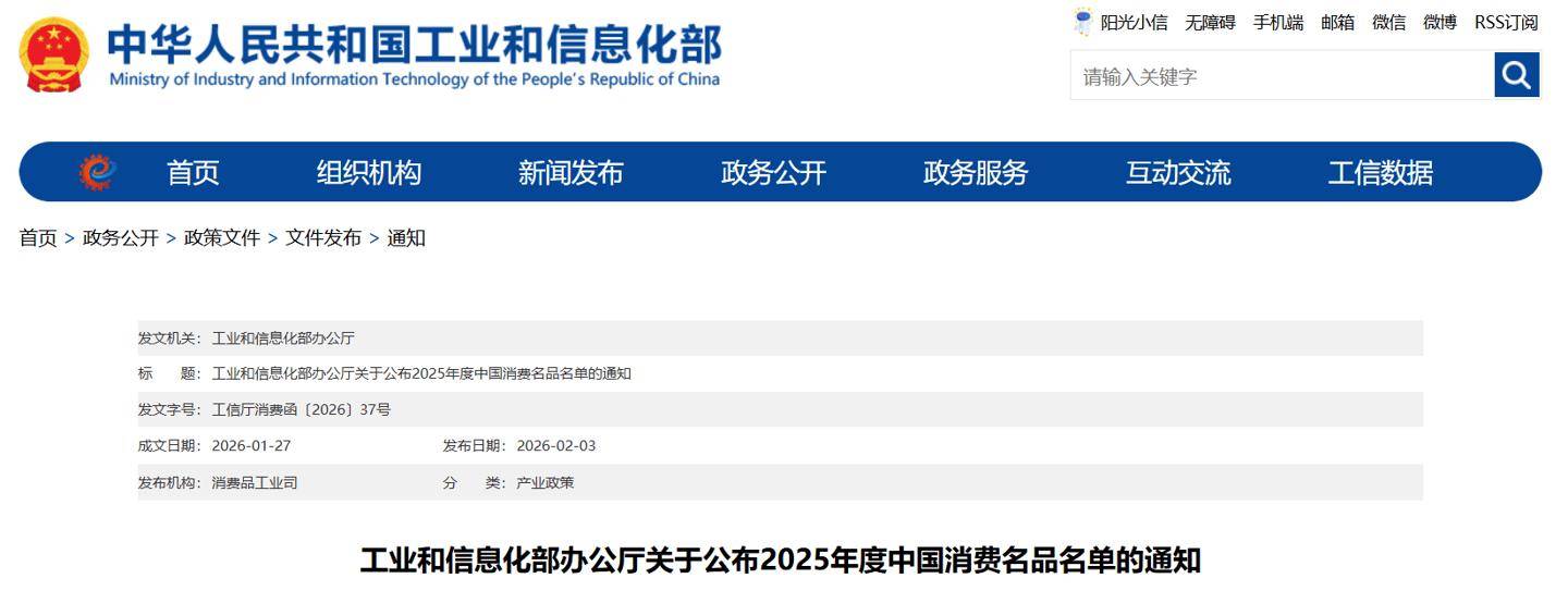 经企业申报、省级工业和信息化主管部门初审推荐、专家评审和网上公示,工业和信息化部确定了 2025 年度中国消费名品名单,现予以公布。