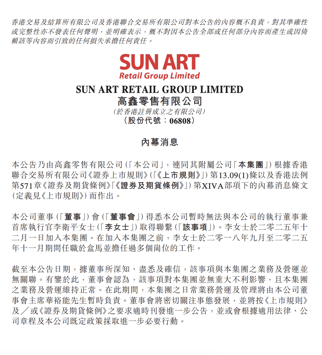 2月4日,高鑫零售有限公司发布关于管理层相关情况的说明:公司暂时无法与执行董事兼首席执行官李卫平取得联系。为确保公司运营的稳定性与连续性,目前相关经营管理工作已由高鑫零售董事会主席华裕能统筹代管。