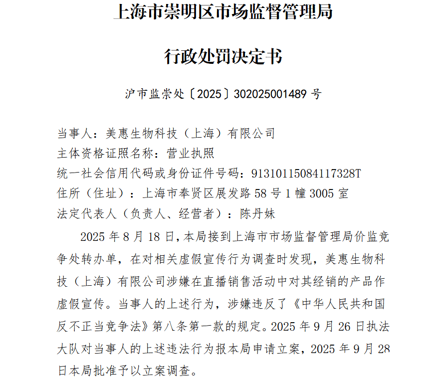 上海市市场监管局公布的行政处罚决定书显示,美惠生物科技(上海)有限公司为上海菌小宝健康科技有限公司的“菌小宝系列”产品在电商渠道的经销商。2025年6月18日,该公司为推广其经销的一款“太空30号”产品,通过有赞平台的“菌小宝官方旗舰店”对外直播,宣传“太空30号,女性专属的,守护我们女性私密花园的超强卫士……10天会让你的整个环境有非常强的改善,包括有一些炎症、异味”“外阴白斑引起的外阴瘙痒有用的”“有妇科炎症的困扰……10天见效,30 天巩固”等内容。