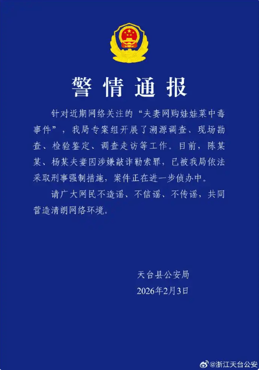 针对近期网络关注的“夫妻网购娃娃菜中毒事件”,我局专案组开展了溯源调查,现场勘查,检验鉴定,调查走访等工作。目前,陈某某,杨某夫妻因涉嫌敲诈勒索罪,已被我局依法采取刑事强制措施,案件正在进一步侦办中。