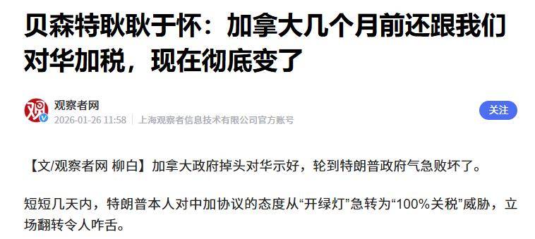 信息来源:贝森特耿耿于怀:加拿大几个月前还跟我们对华加税,现在彻底变了 观察者网 2026-01-26 11:58
