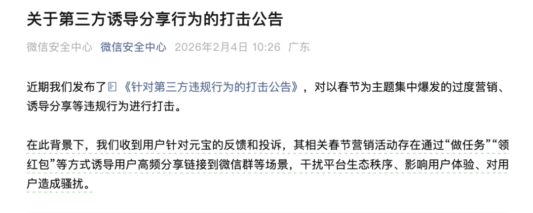 在此背景下,平台收到用户针对元宝的反馈和投诉,其相关春节营销活动存在通过“做任务”“领红包”等方式诱导用户高频分享链接到微信群等场景,干扰平台生态秩序、影响用户体验、对用户造成骚扰。