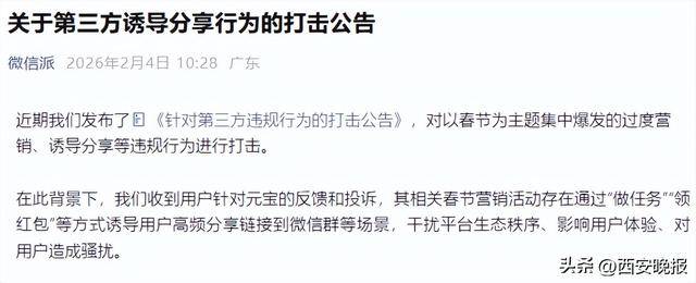 2月4日,微信官方账号微信派发布关于第三方诱导分享行为的打击公告。