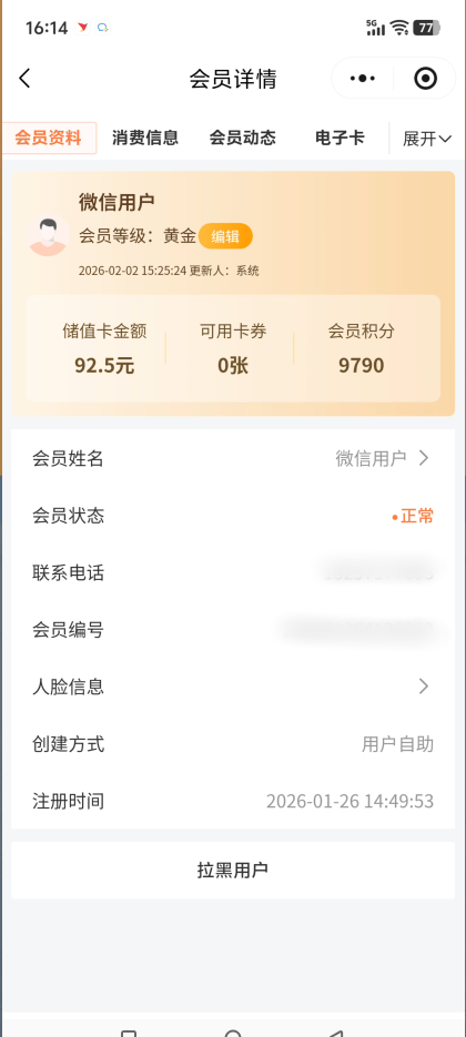 等级调整:支持人工修改会员等级,修改后系统将不再自动根据消费情况更新。