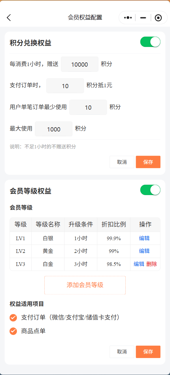等级升级条件:同样基于实际消费时长计算,您还可以自行勾选是否将支付订单和商品点单计入升级条件。