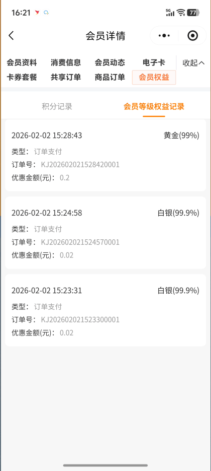 在会员详情页中,我们新增了“会员权益”标签,在里面清晰展示积分记录和会员等级权益记录。
