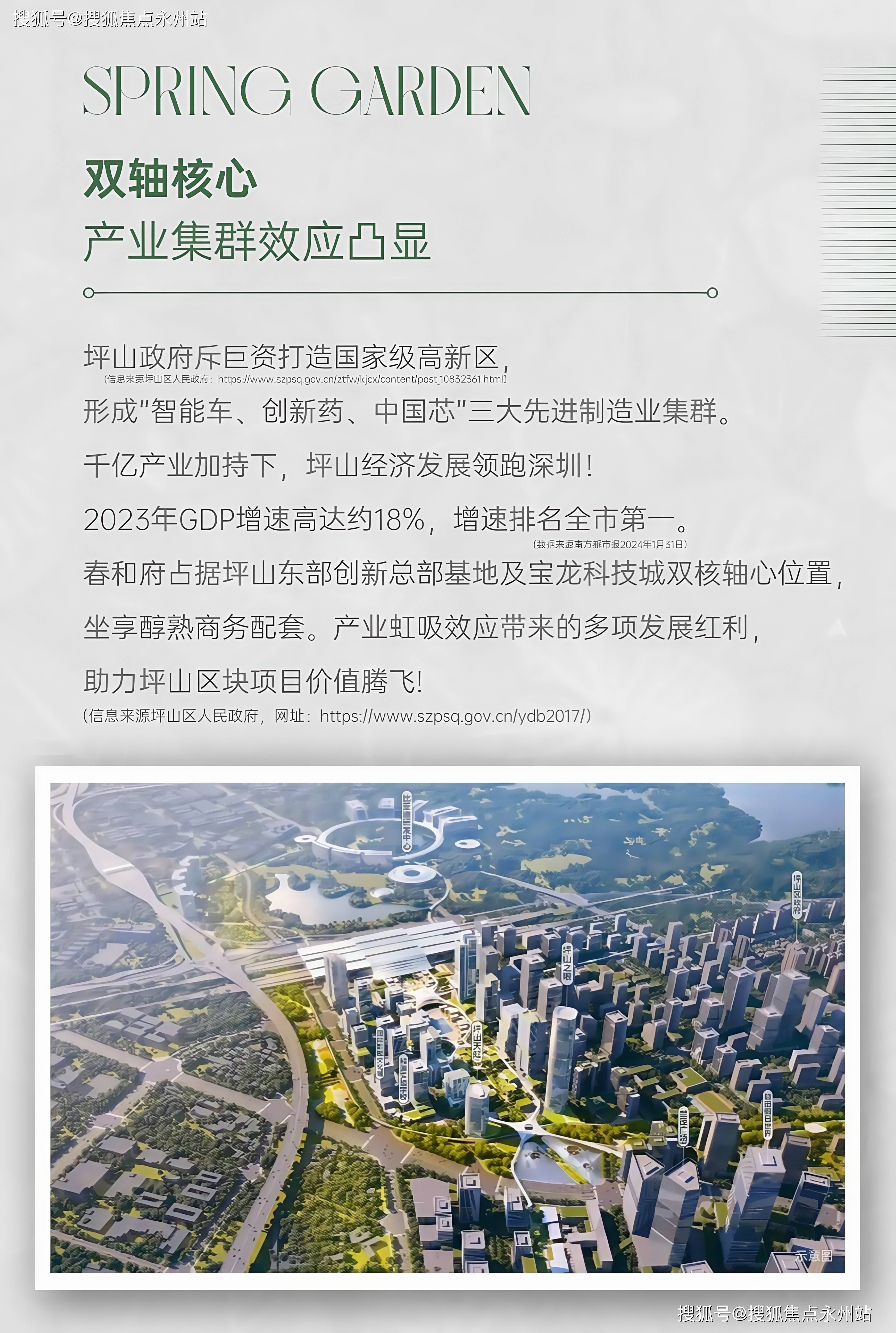 产业驱动:坪山区聚焦 “智能车、创新药、中国芯” 三大产业集群,2023 年 GDP 增速达 18%,2024 年生物医药、新能源等产业产值持续增长。宝龙科技城与东部创新总部基地的产业集聚将吸引高净值人群,推动区域价值提升。