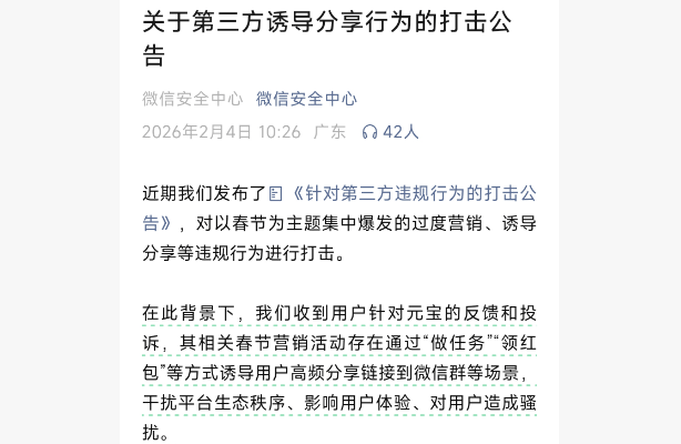 我看了下微信的《外部链接内容管理规范》,再看了下微信官方公告,元宝此次被限制的核心原因,是其春节红包营销活动存在“通过利益诱惑诱导用户高频分享”的行为。
