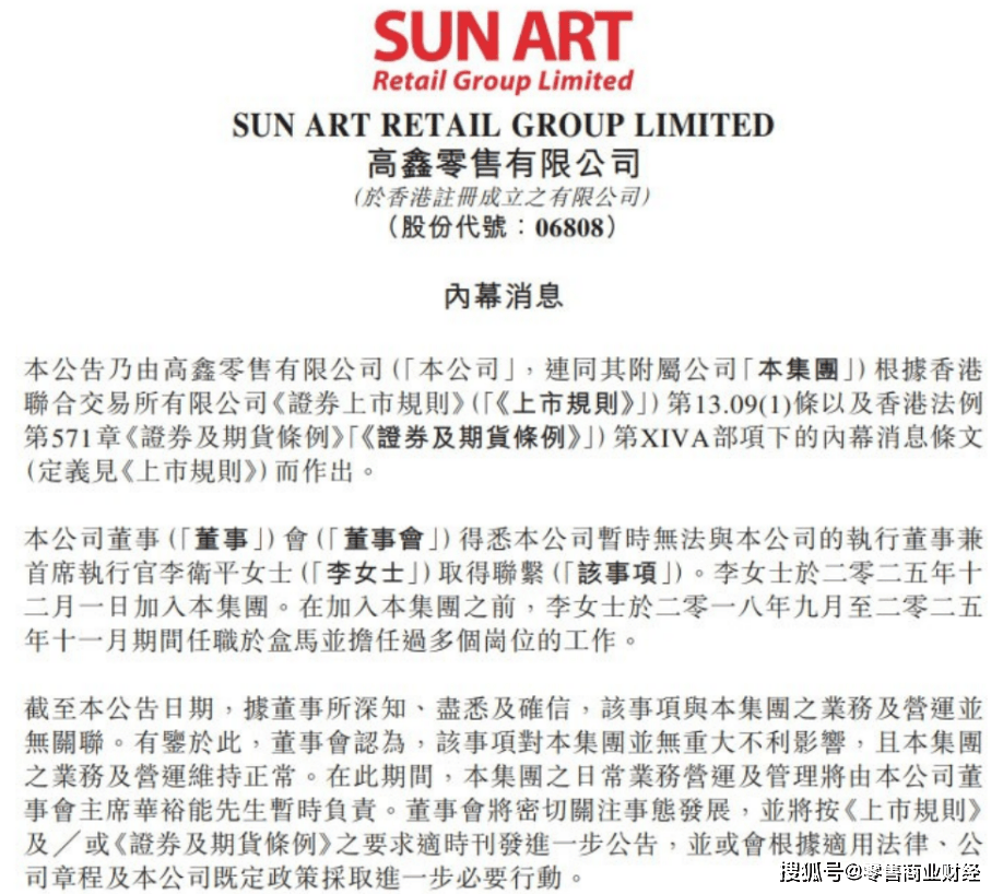 大润发母公司高鑫零售公告:暂时无法联系CEO李卫平,业务运营不受影响
